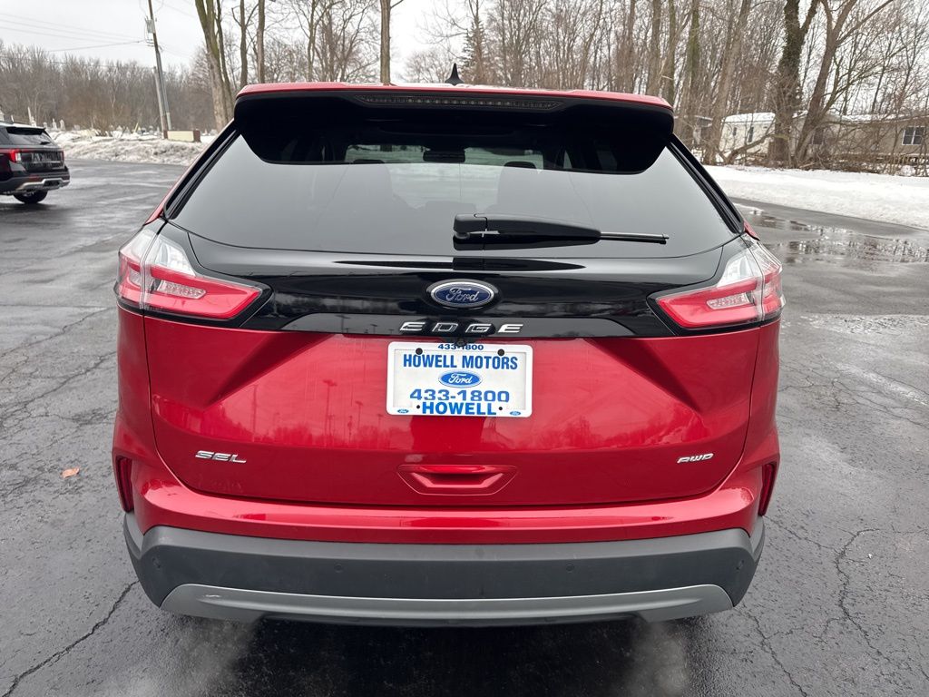 Rapid Red Metallic Tinted Clearcoat 2022 Ford Edge SEL EcoBoost 2.0L I4 GTDi DOHC Turbocharged VCT AWD 8-Speed Automatic AWD. Well Equipped with: Convenience Package (110V/150W AC Power Outlet, Fog Lamps w/Chrome Bezel, Perimeter Alarm, Power Liftgate, Remote Start System, SecuriCode Keyless Entry Keypad, Universal Garage Door Opener (UGDO), and Wireless Charging Pad), Equipment Group 201A, AWD, 3.80 Axle Ratio, 4-Wheel Disc Brakes, 6 Speakers, ABS brakes, ActiveX Seating Material Heated Bucket Seats, Air Conditioning, Alloy wheels, AM/FM radio: SiriusXM with 360L, Auto High-beam Headlights, Auto-dimming Rear-View mirror, Automatic temperature control, Brake assist, Bumpers: body-color, Compass, Delay-off headlights, Driver door bin, Driver vanity mirror, Dual front impact airbags, Dual front side impact airbags, Electronic Stability Control, Emergency communication system: SYNC 4 911 Assist, FordPass Connect, Four wheel independent suspension, Front & Rear Floor Liners w/o Carpet Mats, Front anti-roll bar, Front Bucket Seats, Front Center Armrest w/Storage, Front dual zone A/C, Front reading lights, Fully automatic headlights, Heated door mirrors, Heated front seats, Heated Steering Wheel, Illuminated entry, Knee airbag, Low tire pressure warning, Occupant sensing airbag, Outside temperature display, Overhead airbag, Overhead console, Panic alarm, Panoramic Vista Roof, Passenger door bin, Passenger vanity mirror, Power door mirrors, Power driver seat, Power passenger seat, Power steering, Power windows, Radio: AM/FM Stereo/MP3 Capable, Rear anti-roll bar, Rear Parking Sensors, Rear reading lights, Rear seat center armrest, Rear window defroster, Rear window wiper, Remote keyless entry, SiriusXM w/360L, Speed control, Speed-Sensitive Wipers, Split folding rear seat, Spoiler, Steering wheel mounted audio controls, SYNC 4A w/Enhanced Voice Recognition, Tachometer, Telescoping steering wheel, Tilt steering wheel, Traction control, Trip computer, Variably intermittent wipers, and Wheels: 18 Sparkle Silver-Painted Aluminum. Clean CARFAX. Here at Howell Motors Ford, you come first! Our Ford dealership in Lockport, NY, is Where Friends Send Friends, because our incredible reputation precedes us. It's been this way since we were first established in 1914, as our family-owned Ford dealer has always placed a focus on the community above all else.