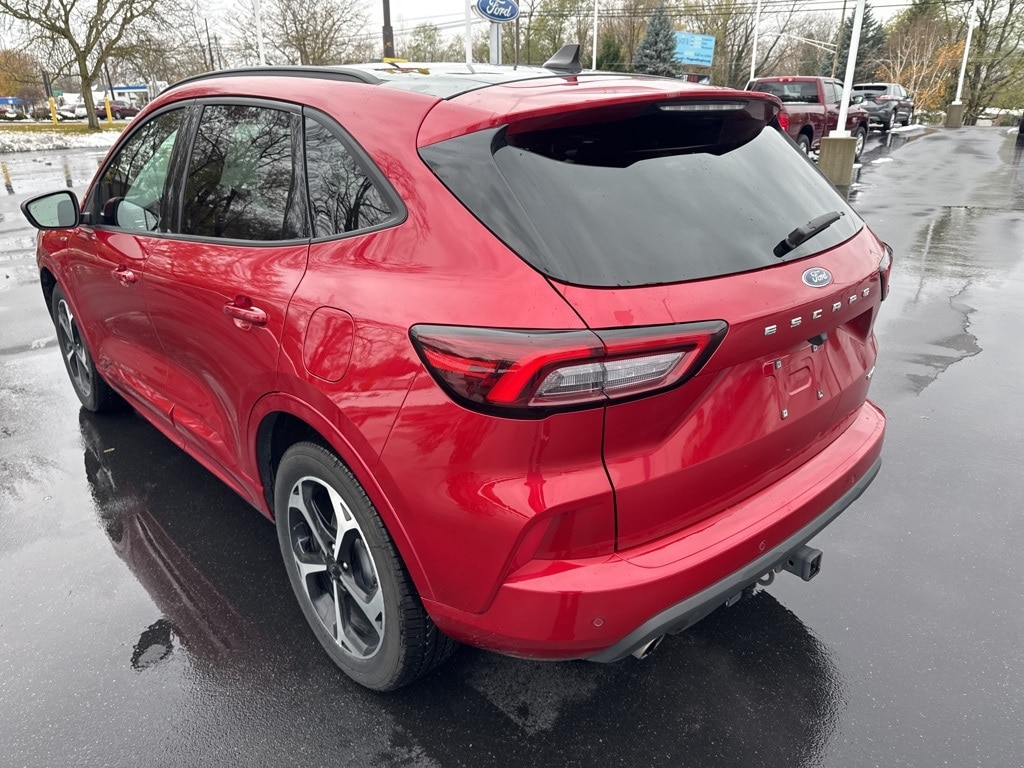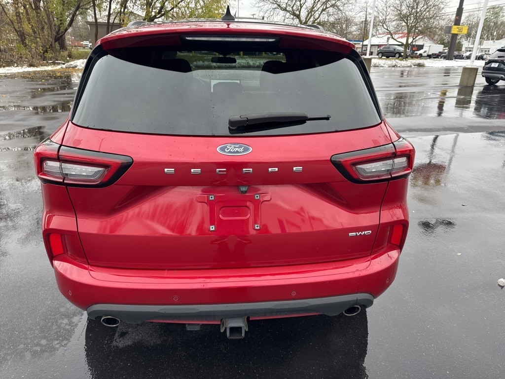 Rapid Red Metallic Tinted Clearcoat 2023 Ford Escape ST-Line Select EcoBoost 2.0L I4 GTDi DOHC Turbocharged VCT AWD 8-Speed Automatic AWD. Well Equipped with: Class II Trailer Tow Package, Equipment Group 401A, Memory Package, Tech Pack #2 (10-Way Power Driver's Seat, 12.3 Productivity Screen in Instrument Cluster, 360-Degree Camera w/Split View, 6-Way Power Passenger Seat, Body Color Mirrors, Connected Built-In Navigation, Ford Co-Pilot360 Assist 2.0, HD Radio, Intelligent Adaptive Cruise Control w/Stop-and-Go, Intersection Assist, Radio: B&O Sound System by Bang & Olufsen, Rear Parking Sensor, Reverse Brake Assist, SecuriCode Keyless Entry Keypad, Speed Sign Recognition, SYNC 4 w/Enhanced Voice Recognition, and Wireless Charging Pad), AWD, 2.91 Axle Ratio, 4-Wheel Disc Brakes, 6 Speakers, ABS brakes, Air Conditioning, Alloy wheels, AM/FM radio: SiriusXM, AM/FM Stereo, Auto High-beam Headlights, Automatic temperature control, Black Roof-Rack Side Rails, Brake assist, Bumpers: body-color, Compass, Delay-off headlights, Driver door bin, Driver vanity mirror, Dual front impact airbags, Dual front side impact airbags, Electronic Fuel Door Release, Electronic Stability Control, Emergency communication system: SYNC 4 911 Assist, Exterior Parking Camera Rear, FordPass Connect, Four wheel independent suspension, Front anti-roll bar, Front Bucket Seats, Front Center Armrest, Front dual zone A/C, Front fog lights, Front License Plate Bracket, Front reading lights, Fully automatic headlights, Heated door mirrors, Heated front seats, Heated steering wheel, Heated Vinyl/Cloth Front Sport Contour Bucket Seats, Illuminated entry, Knee airbag, Low tire pressure warning, Neutral Towing Capability, Occupant sensing airbag, Outside temperature display, Overhead airbag, Overhead console, Panic alarm, Panoramic Vista Roof, Passenger door bin, Passenger vanity mirror, Pedestrian Alert Sounder, Power door mirrors, Power driver seat, Power Liftgate, Power steering, Power windows, Radio data system, Rear anti-roll bar, Rear reading lights, Rear seat center armrest, Rear window defroster, Rear window wiper, Remote keyless entry, Speed control, Speed-sensing steering, Speed-Sensitive Wipers, Split folding rear seat, Spoiler, Sport steering wheel, Steering wheel mounted audio controls, SYNC 4, Tachometer, Telescoping steering wheel, Tilt steering wheel, Traction control, Trip computer, Variably intermittent wipers, Wheels: 18 Rock Metallic Painted Aluminum, and Wheels: 19 Machined-Face Ebony-Painted Aluminum. Clean CARFAX. CARFA